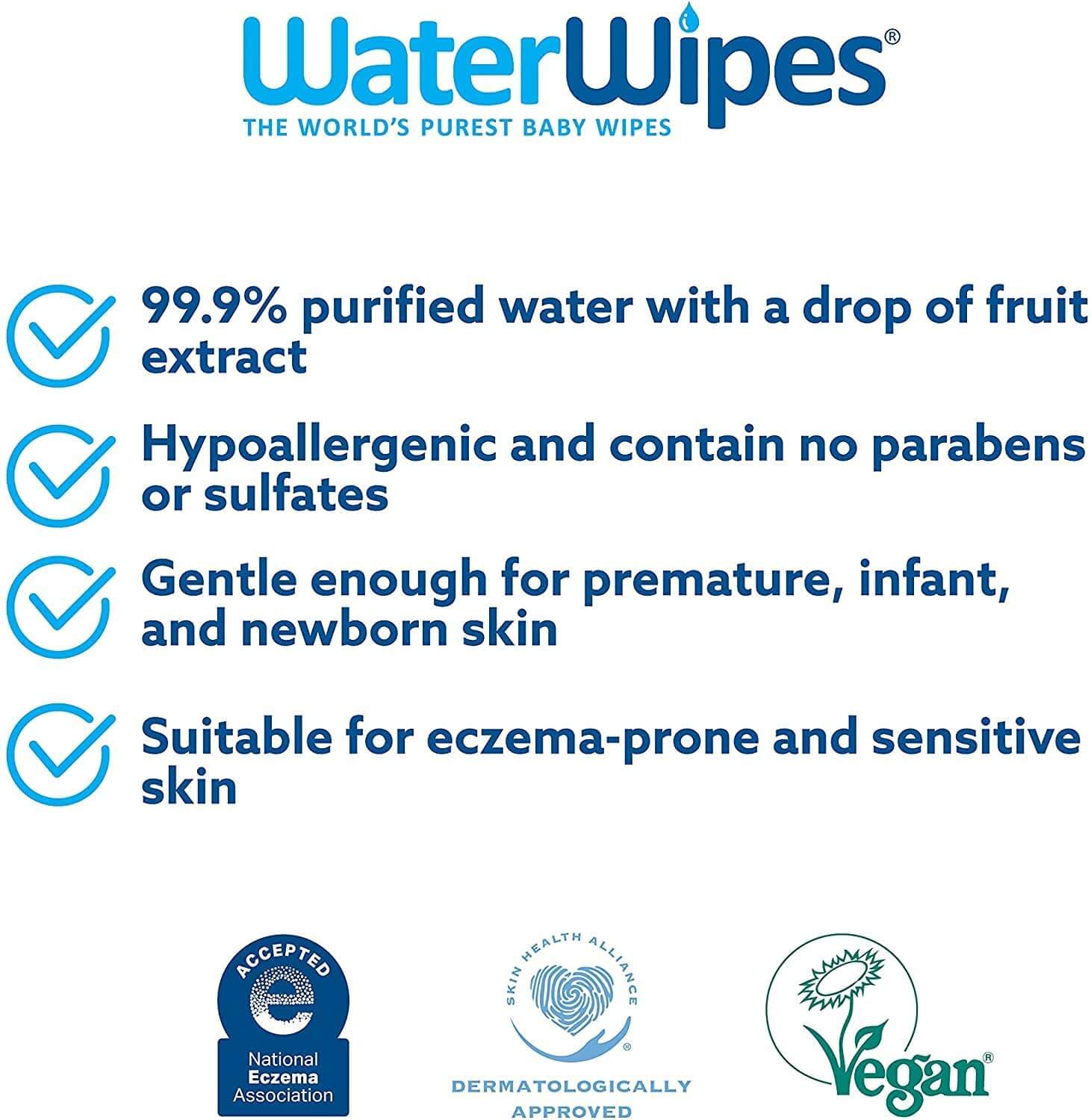 WaterWipes are the world’s purest baby wipe – 99.9% water and a drop of fruit extract. Suitable for premature, infant, and newborn skin; effective clean yet ultra-mild, pure, gentle. WaterWipes are a suitable alternative to cloth and water and ideal for frequent, convenient cleaning for baby’s delicate skin. As baby’s skin develops over the first year of life, it’s especially delicate and sensitive. WaterWipes have been lovingly made to cleanse effectively, without the use of additional ingredients found in many common baby care products and are accepted by the National Eczema Association.